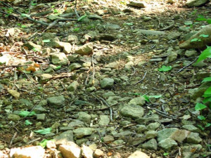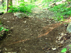 Don’t waste time building a waterbar where one isn’t needed or won’t work right. One of the best clues to future erosion is past erosion, which is why crews give first priority to building water bars just above eroded sections of trail, i.e., areas with a scoured appearance and with rocks and gravel on the surface (Figure 1). Dedicated overseers visit their trails during or just after rainstorms in order to learn how water behaves on the trail and where water bars might be useful.
