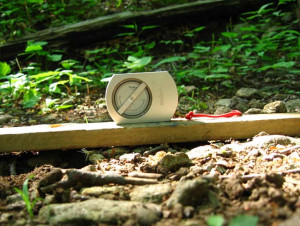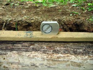 Using a clinometer and any long, flat object, measure the trail slope at the waterbar location you’ve chosen (Figure 5). Be sure to measure directly in line with the trail (i.e., the direction of travel) at the point where the center of the log will go. Then use the table below to determine the slope that the log in the finished waterbar will have. A trail slope of 12.5°, as in the present example, will require a waterbar slope of just under 11°. When finished, the waterbar will be perfectly integrated into the trail.