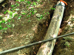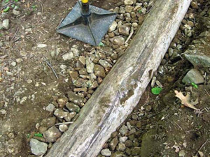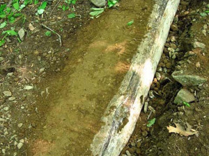 Although rock water bars boast many advantages, log water bars are much faster and easier to build, and logs can be hauled to almost any site. In PATC territory, the species of choice is black locust. If properly prepared and installed, a locust log will last for decades without rotting. If possible, find a freshly fallen locust with sound, dense wood, and cut a reasonably straight log that’s 7 feet long and 6 to 12 inches in diameter (the larger the better). Look at the ends to make sure there’s no internal rot. Saw any branches off flush and skin off every vestige of bark with a sharp drawknife and/or a sharp axe. Don’t use a log with deep checks or cracks, which will propagate as it dries.