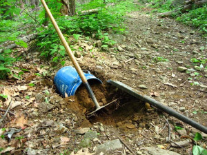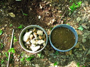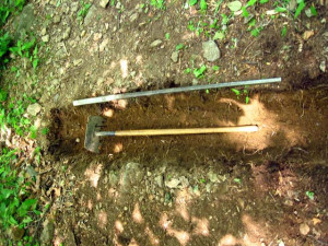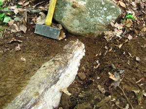Leaving the rock bar on the ground as much as possible for guidance, use your pick, shovel, and McLeod to dig a trench on the uphill side of the bar about one bucket length longer on each end than the bar itself, i.e., a bit over 7 feet in total length. Clip or saw roots out of the way and dispose of them well out of sight off the trail. While digging, take care not to disturb the tread downhill from the rock bar. Use buckets to gauge the width and depth of the trench (see Figure 7) and to collect rocks and dirt (see Figure 8), which can be put in separate piles well uphill (i.e., more than 10 feet) of the waterbar until they’re needed.