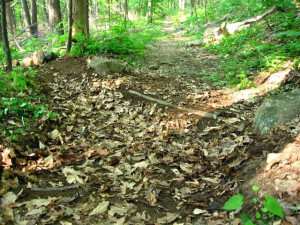 The ideal waterbar looks natural and inconspicuous, creates no obstacle for hikers going either direction, remains reasonably clear of leaves and debris, and prevents serious erosion downhill from it.