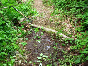 A properly built log waterbar will function effectively for decades if its outflow channel is raked out annually. Hikers will walk right over it (not around it) without even noticing it, and water will be diverted from the trail before it can cause serious erosion. During your annual waterbar cleaning, take note of water bars that have been heavily scoured and have large amounts of tread material deposited in or at the end of their outflow channels. Much of that material can be reclaimed and tamped onto the downhill sides of these water bars, where it’s often needed because of the compaction and displacement caused by hiker traffic. Rather than engaging in the losing battle of armoring overburdened water bars with paving rocks or riprap trays in their outflow channels, give them a fighting chance by building new water bars up-slope from them.