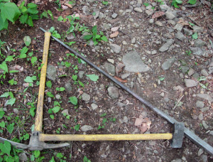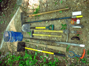 Tools useful for waterbar construction, from top left to bottom right in Figure 4, include: